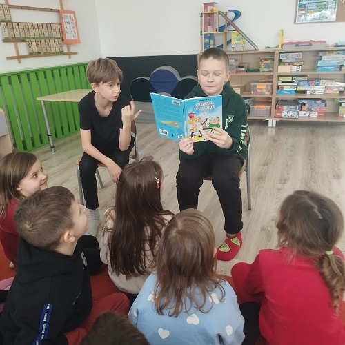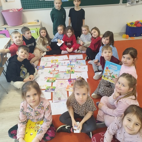 W lutym wzięliśmy udział w ogólnopolskiej akcji czytelniczej „LUTY Z CUKIERKIEM – KSIĄŻKI Z PAZUREM”. W ramach wydarzenia poznawaliśmy przygody sympatycznego kota Cukierka z książki „Cukierku, Ty łobuzie!” autorstwa Waldemara Cichonia. Książkę czytała nam nasza pani oraz zaproszeni starsi koledzy ze Szkoły Podstawowej nr 4. Jeden z nich opowiedział, jak i kiedy został fanem serii o Cukierku. Przyniósł ze sobą wszystkie części audiobooków i wyjaśnił, dlaczego jest to jego ulubiona książka. Na zakończenie akcji wykonaliśmy ilustracje do wybranego rozdziału. To była bardzo ciekawa i inspirująca przygoda z książką!