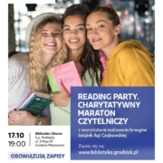 Zapraszamy młodzież na Reading Party. Charytatywny Maraton Czytelniczy. W Noc Bibliotek czytamy przez całą noc i pomagamy Domowi Samotnej Matki w Laskach, który współpracuje z Grodziskiem Mazowieckim. I wszystko to z inicjatywy młodzieży odwiedzającej naszą bibliotekę.