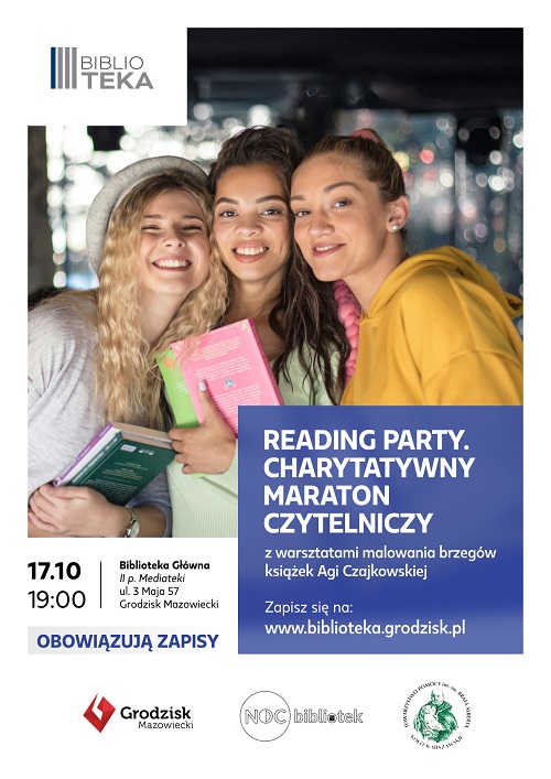 W Bibliotece Publicznej Gminy Grodzisk Mazowiecki z inicjatywy młodzieży z młodzieżowego wolontariatu bibliotecznego organizujemy Reading Party. Charytatywny Maraton Czytelniczy. To wydarzenie przeniesione z bookstagrama do realnego życia. Polega ono na zebraniu się młodych ludzi (u nas 13-17 lat) w celu wspólnego czytania w tym samym czasie. Jest to coraz bardziej popularny trend w Stanach Zjednoczonych, gdzie z inicjatywy młodych dorosłych organizuje się Reading Parties – spotkania w celu czytania wspólnie książek i poznawania się ludzi lubiących literaturę.